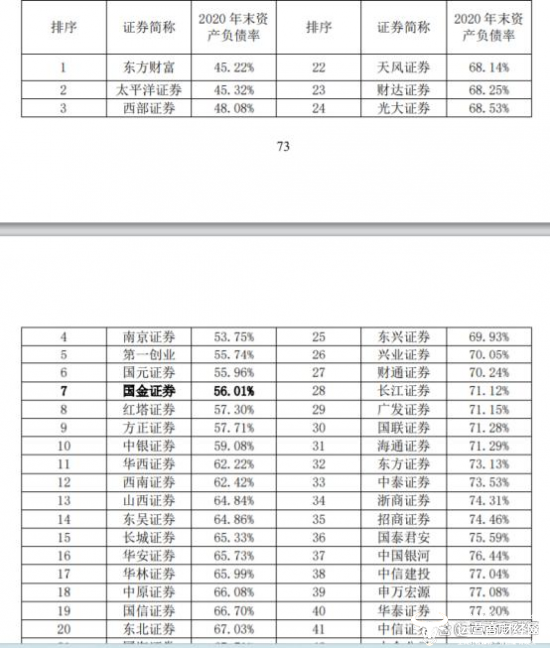 资料显示,根据截至2020年末的上市证券公司资产负债率排名,行业中最低的是东方财富,资产负债率只有45.22%,有25家证券公司资产负债率低于70%,国泰君安证券76.77%的资产负债率居于中游水平,但这是否算“负债结构合理”,仁者见仁智者见智。