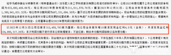 值得一提的是,今年4月,乐歌股份发布了《关于公司2023年度利润分配预案的公告》。以2023年12月31日公司总股本约3.12亿股为基数,向公司全体股东每10股派发现金红利4.0元(含税),共派发现金红利约1.25亿元,本次利润分配不进行资本公积转增股本,不送红股,剩余未分配利润结转以后年度分配。