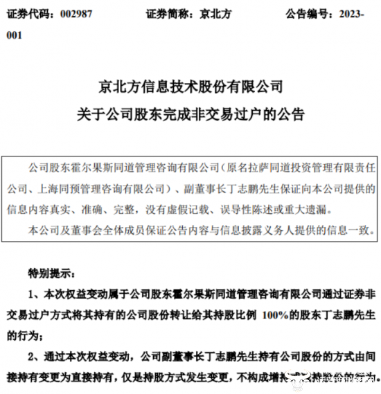 此外,值得关注的是,2023年1月,京北方发布了一则关于公司股东完成非交易过户的公告。此次过户属于京北方股东霍尔果斯同道管理咨询有限公司通过证券非交易过户方式将其持有的公司股份转让给其持股比例 100%的股东丁志鹏的行为。