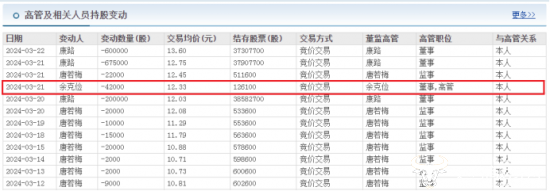 值得注意的是,2024年3月21日,余克俭以竞价交易的方式减持股份42000股,交易均价为12.33元,根据计算可知此次减持股份余克俭共套现约51.7万。