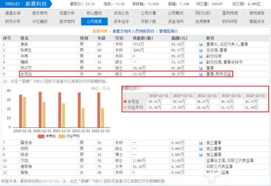 东方财富网显示,余克俭2023年的薪酬为38.37万,在新晨科技高管行列中并不突出,并且近几年余克俭的薪酬基本上那个没有变化,变动幅度不超过3万元。