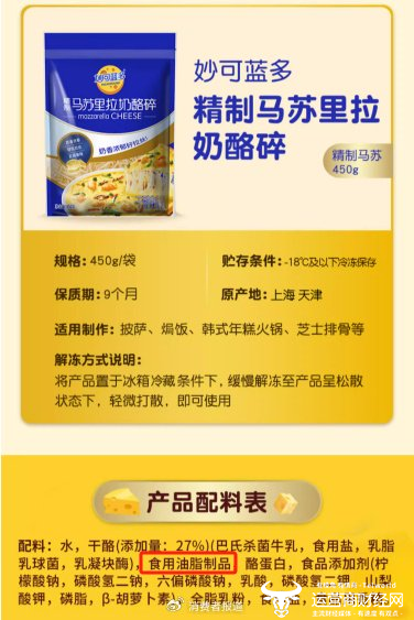 另外,有媒体报道称,妙可蓝多多数产品的配料表都未见“食用油脂制品”,主要有一款名为“精制马苏里拉奶酪碎”的产品,含“食用油脂制品”的成分。
