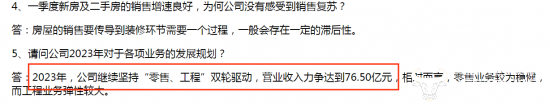 据悉,伟星新材在2023年4月28日的投资者关系活动记录表中称,2023年,公司继续坚持“零售、工程”双轮驱动,营业收入力争达到76.50亿元,相对而言,零售业务较为稳健,而工程业务弹性较大。