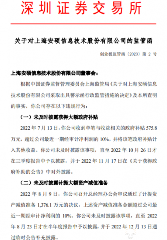 此外值得关注的是,2023年1月,安硕信息收到了来自深圳证券交易所创业板公司管理部的监管函。此次被监管是由于公司2022年未及时披露获得大额政府补贴和计提大额资产减值准备,于是深交所决定对安硕信息采取出具警示函行政监管措施的决定。这值得公司吸取教训。
