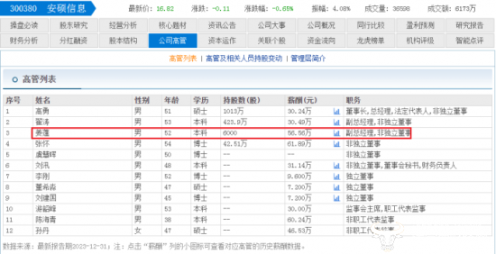 东方财富网显示,2023年姜蓬的薪酬为56.56万。另一位副总经理翟涛的薪酬为30.49万,二人都是2023年3月开始任职,姜蓬的薪酬比翟涛的薪酬高出了26.07万,可见姜蓬的工作能力应该很强,受公司认可。当然,这还是他们2023年3月上任后的薪酬,并非2023年全年的薪酬。