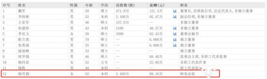 据东方财富网披露的高管薪酬中,可以看到杨雪莉的年薪为89.18万。