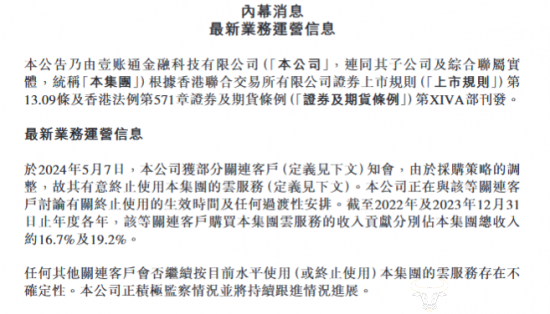 5月7日,金融壹账通再次发布公告称,部分关连客户因采购策略调整,计划于2024年5月7日起终止使用其云服务。