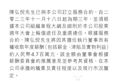 值得一提的是,陈弘倪因为担任执行董事,收取的年度薪酬(包括薪金、津贴及实物利益)约人民币470万元。