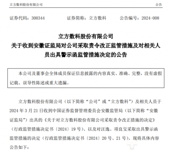 此外,值得一提的是,2024年3月21日,立方数科发布关于收到安徽证监局对公司采取责令改正监管措施及对相关人员出具警示函监管措施决定的公告,其中就有项良宝。此次被处罚是由于未履行关联交易审议流程和披露义务、财务会计核算不规范以及内幕信息知情人登记管理不规范。