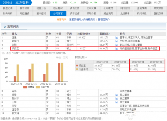 东方财富网显示,2023年项良宝的薪酬为81.64万,在立方数科披露出的高管薪酬中位居第三,总经理余珂白和董事长汪逸的薪酬都在他之上。不过值得关注的是,2022年项良宝的薪酬为33.8万,一年间涨薪47.84万,涨幅相当大了。