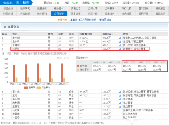 东方财富网显示,2023年赵秀田的薪酬为410万,位居东山精密披露出的高管薪酬之首,且远高于其他高管,并且赵秀田已经连续三年领取410万的薪酬,可见其在公司的重要地位。不过,尽管赵秀田薪酬颇高,却并未持有公司股份。