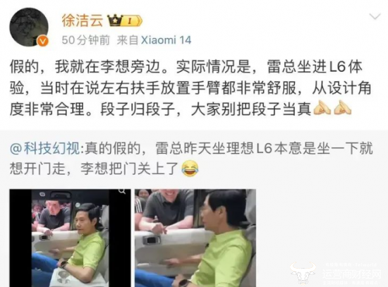 也有网友在公开平台问“真的假的,雷总昨天坐理想L6本意是坐一下就想开门走,李想把门关上了”小米集团副总经理徐洁云回复表示“假的,我就在李想旁边。实际情况是,雷总坐进L6体验,当时在说左右扶手放置手臂都非常舒服,从设计角度非常合理。段子归段子,大家别把段子当真。”据了解,徐洁云统筹小米传播工作,分管集团公关部。