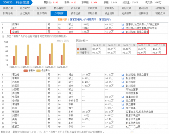 东方财富网显示,2023年李建华的薪酬为45.24万,是2023年唯一一位薪酬下降的副总,在科创信息五位副总中,另外四位副总都是2022年上任,其中只有李典斌的薪酬在李建华之下,其余人的薪酬都高于李建华。
