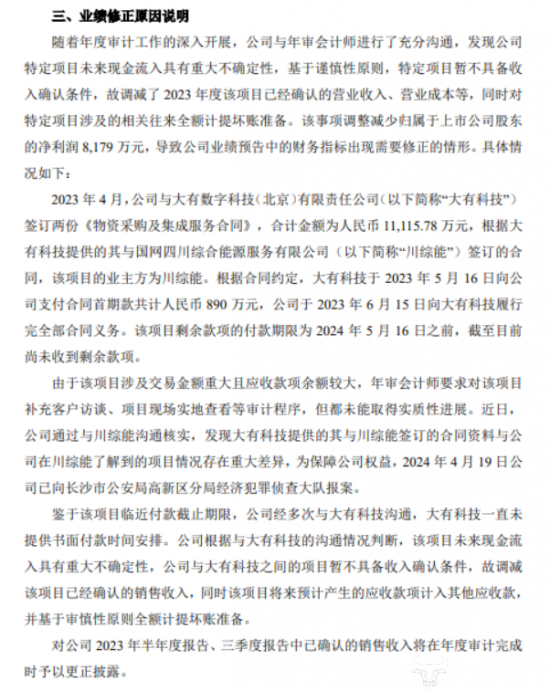值得关注的是,科创信息于2024年4月19日发布了2023年度业绩预告修正公告。公告中表示2023年4月,公司与大有科技签订两份《物资采购及集成服务合同》,合计金额为人民币11,115.78万元,根据合同约定,大有科技的项目剩余款项付款期限为2024年5月16日之前,截至目前尚未收到剩余款项。