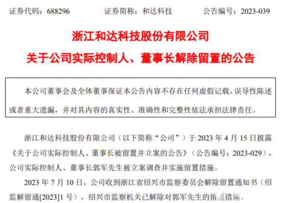 2023年7月11日,和达科技再次发布公告,表示公司收到浙江省绍兴市监 察委员会解除留置通知书,绍兴市监 察机关已解除对郭军先生的留置措施。