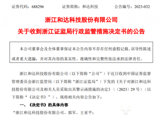 随后,4月22日,和达科技又发布了关于收到浙江证监局行政监管措施决定书的公告。此次被警示是由于公司及郭军、王亚平在未履行决策程序和信息披露义务的情况下变更募集资金具体使用用途的情形。