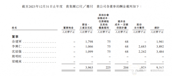 不过,其中主要是股份支付费用,达268.3万元。单薪金、工资及花红来看的话,李兴仁去年106.6万元,没有余建军高,也没有另一副总沈洁强高。