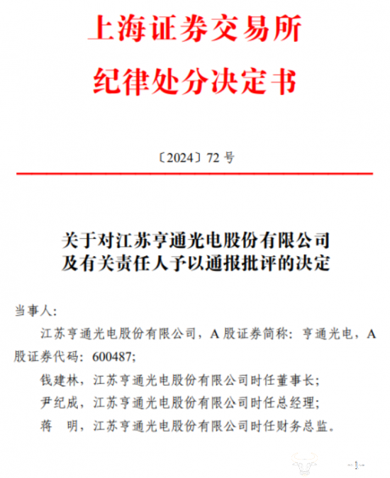 值得关注的是,2024年4月29日,亨通光电收到了来自上海证券交易所的关于对江苏亨通光电股份有限公司及有关责任人予以通报批评的决定,当事人除公司外还有时任董事长钱建林、时任总经理尹纪成以及时任财务总监蒋明。