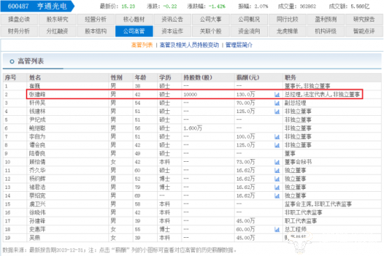 东方财富网显示,2023年张建峰的薪酬为130万,在亨通光电披露出的高管薪酬中位居首位,并且这已经是张建峰第二年领取130万薪酬。