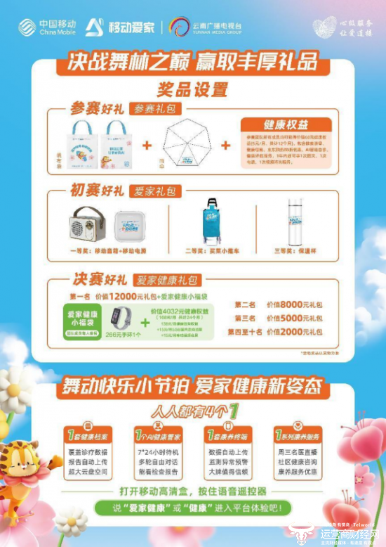 大赛的奖励也十分丰厚。所有参赛者均可获得包含云南移动健康权益的参赛礼包。初赛优胜者将有机会赢取爱家礼包,而参与决赛的获奖者则将有机会获得爱家健康礼包。特别是荣获冠军的队伍还将获得价值12000元大礼包,以及价值266元的手环和价值4032元的云南移动专属健康权益,这些健康权益包括健康咨询权益、国内定向流量和咪咕视频会员,尽享云南移动带来的健康福利!