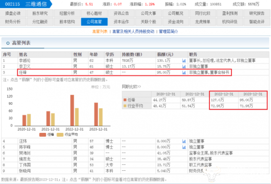 东方财富网显示,2023年任锋的薪酬为95万元,在三维通信披露出的高管薪酬中位居第二,仅次于董事长李越伦的130.1万。此外,值得一提的是,2022年任锋的薪酬为127万,不知为何2023年任锋的薪酬会大幅下降32万。