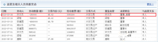 值得关注的是,2023年3月,许文杰以大宗交易的方式减持了股份25万股,交易均价为48.42元,根据计算可知,此次减持股份许文杰共套现约1210.5万元。
