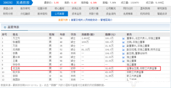 东方财富网显示,2023年沈玉良的薪酬为32.6万,根据吴通控股历年年报可知,自担任监事会主席以来,沈玉良的薪酬一直都稳定在32.6万,不曾上升也没有下降。而非职工代表监事李阳的薪酬为43万,比沈玉良的薪酬还高出了10.4万,32.6万这一薪酬数在吴通控股的高管中还是比较低的。