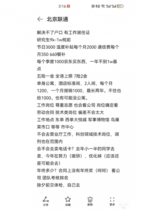 相比之下,联通北方某大城市分公司员工待遇比该省公司要好一些。