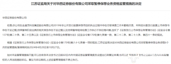具体来看,华西证券在为金通灵2019年保荐上市过程中,尽职调查工作未勤勉尽责、向特定对象发行股票上市保荐书、持续督导阶段出具的相关报告存在不实记载,被江苏证监局暂停保荐业务资格6个月,从2024年4月28日暂停至10月27日。