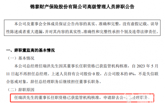 此外,自2023年5月公司原总经理任瑞洪升为董事长,不再担任总经理职务后,锦泰财险总经理一职已经空缺一年时间了,现在还没有人选。