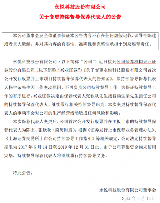 据永悦科技公告披露,2021年,永悦科技保荐机构仍为兴业证券。