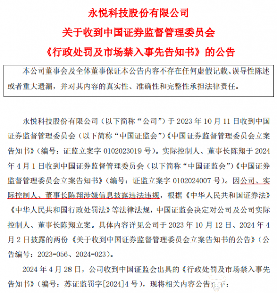 4月28日,永悦科技公告称收到证监会《行政处罚及市场禁入事先告知书》,文件显示,永悦科技涉嫌2022、2023定期报告存在6630.7万元重大遗漏等违法行为,证监会拟对其警告并罚款1300万元,相关时任高管拟被警告并合计罚款1220万元。