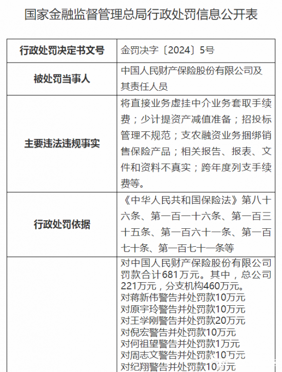 5月17日,国家金融监督管理总局公布一则行政处罚信息公开表,文件显示,中国人民财产保险股份有限公司因存在将直接业务虚挂中介业务套取手续费;少计提资产减值准备;招投标管理不规范;支农融资业务捆绑销售保险产品;相关报告、报表、文件和资料不真实;跨年度列支手续费等违法违规行为,被国家金融监督管理总局合计罚款681万元。