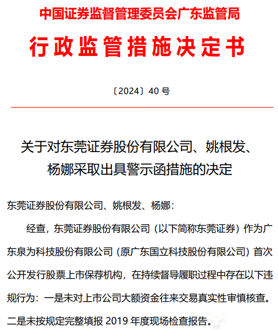5月10日,东莞证券因保荐泉为科技时未对上市公司大额资金往来交易真实性审慎核查、未按规定完整填报2019年度现场检查报告等违规行为,被广东证监局出具警示函。