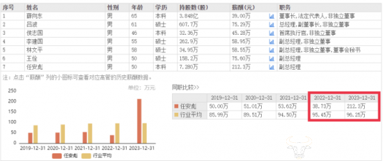 东方财富网显示,2023年任安彪的薪酬为212.3万元。在东华软件的高管之中,这一薪酬已经非常高了,董事长薛向东的薪酬仅为39万元,排在第二位的是副总经理王佺,也只有75.6万元。同为副总经理,王佺与任安彪差了将近137万。而任安彪2022年的薪酬只有38.73万元,同比增长了173.57万元。在这之前,任安彪的薪酬却从未突破过三位数。