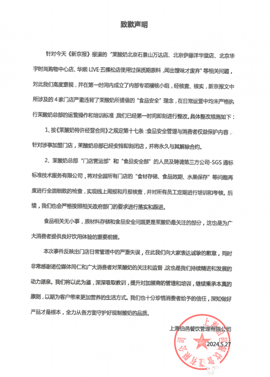 对此,茉酸奶官方在27日下午发布致歉声明,表示茉酸奶总部已经安排闭店,并将永久与其解除合约等。