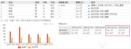 东方财富网显示,2023年车俊河的薪酬为153.3万元,相较于2022年的146.1万元,上升了7.2万元。虽然涨薪幅度不大,但车俊河的薪酬在公司高管之中也很高了,仅次于董事长刘天文,比副总经理杜淼的薪酬高多了,杜淼的年度薪酬只有92.13万。