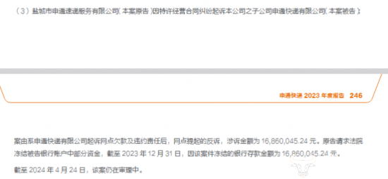盐城市申通速递服务有限公司请求法院冻结申通快递有限公司银行账户中部分资金,截至去年年末,因该案件冻结银行存款1686万元。申通快递表示,截至今年4月24日,该案件仍在审理中。