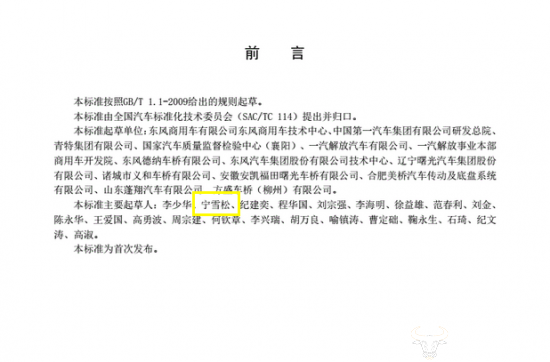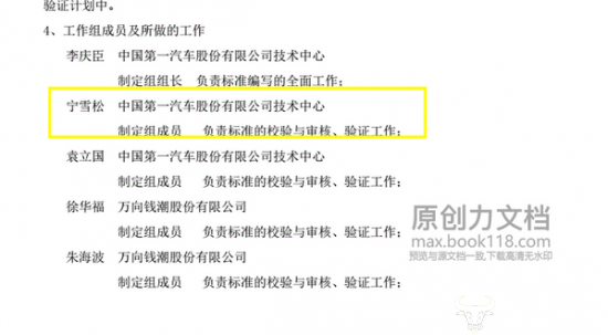 2018年,《汽车传动轴总成技术条件及台架试验方法》标准编制说明中曾出现过宁雪松的名字。如果两个宁雪松是同一个人没说明他当时服务于中国第一汽车股份有限公司技术中心,是该文件的编制成员之一。
