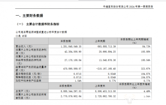 中通客车一季度实现营业收入约12.82亿元,同比增长84.73%;净利润约4238.45万元,同比增长105.08%;经营活动产生的现金流量净额约4.7亿元,同比增长323.67%;