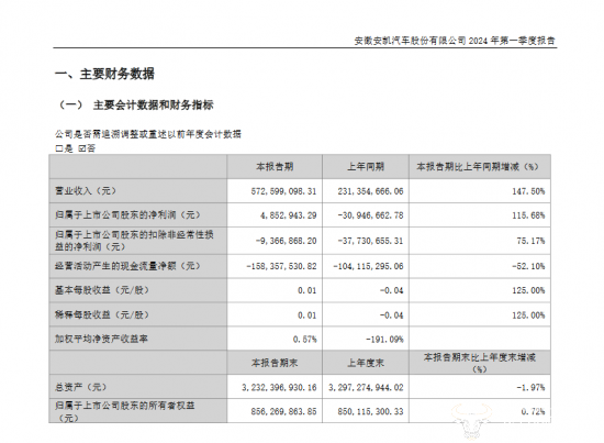 安凯汽车一季度实现营业收入约5.72亿元,同比增长147.50%;净利润约485.09万元,同比增长115.68%;经营活动产生的现金流量净额约-1.58亿元,同比降低52.10%。此外,公司扣非净利润约-936.69万元,同比提高75.17%。