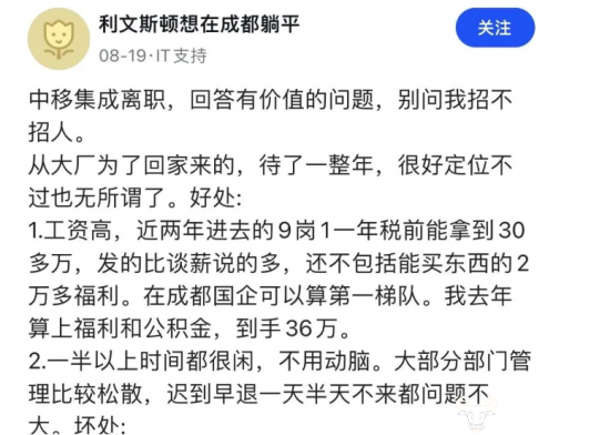 本次运营商财经网注意到2023年一网友的发言。据了解,该网友加入了中国移动较红的专业公司。网友爆料,近两年进去的9岗1一年税前能拿到30多万。也就是说,中移系统集成公司9岗薪酬水平堪比中国移动12级(三级正)的薪酬待遇了。