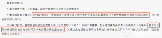 值得注意的是,今年2月8日,朱晓燕通过上海证券交易所交易系统以集中竞价交易方式增持公司股份10万股,占公司总股本的0.0417%。