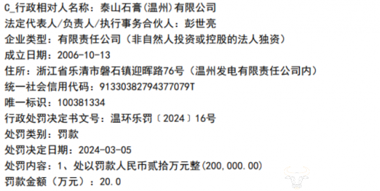 文号为“温环乐罚﹝2024﹞16号”的行政处罚决定书中显示,当事人泰山石膏(温州)有限公司于2023年12月14日在浙江省乐清市磐石镇迎晖路76号实施了超标、超总量、逃避监管方式排放大气污染物的行为,对当事人作出如下行政处罚决定:1.处以罚款人民币贰拾万元整。