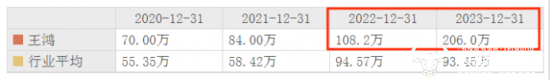 2020年3月起,王鸿加入富森美,担任公司副总经理兼财务总监,至今上任已有4年。根据公司2023年财报,副总经理兼财务总监王鸿年薪为206.0万,由此可计算出,较2022年涨薪97.8万元。