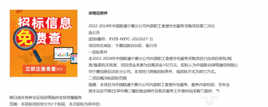 运营商财经网还注意到《2022-2024年中国联通宁夏分公司内部职工食堂外包服务采购项目(第三次)比选公告》,公告显示,本2022-2024中国联通宁夏分公司内部职工食堂外包服务采购项目已由项目审批/核准/备案机关批准,项目资金来源为自筹资金192万元,招标人为中国联合网络通信有限公司宁夏回族自治区分公司。