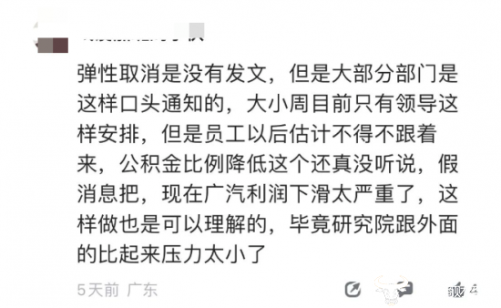 不过,有网友透露:弹性取消是没有发文,但是大部分部门是这样口头通知的,大小周目前只有领导这样安排,但是员工以后估计不得不跟着来,公积金比例降低这个还真没听说过,假消息吧,现在广汽利润下滑太严重了,这样做也是可以理解的,毕竟研究院跟外面的比起来压力太小了。