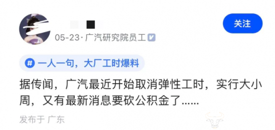 近日,有认证为广汽研究院员工的网友在网上爆料称,传闻广汽最近开始取消弹性工时,实行大小周,又有最新消息要砍公积金了......消息是真的吗?