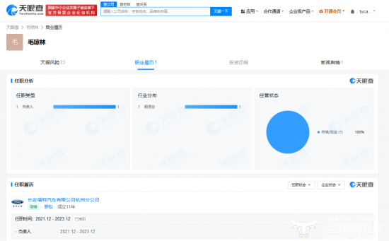 天眼查APP显示其在长安福特汽车有限公司杭州分公司任职时间是2021年12月-2023年12月。