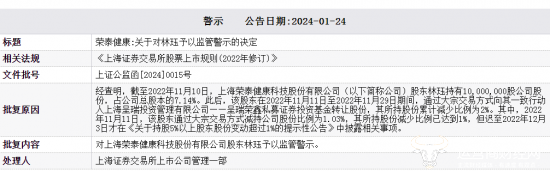 今年1月,上海证券交易所上市公司管理一部对荣泰健康股东林珏予以监管警示(上证公监函〔2024〕0015号)。